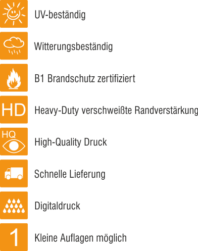 Das Standard PVC-Planenmaterial (Frontlit) hat ein Gewicht von ca. 500 - 550 g/m². Die Besonderheit des Bannermaterials liegt im geschlossenen, planen Aufbau. Somit ist die gesamte Fläche für den Druck nutzbar und ergibt dadurch ein schönes Druckbild.